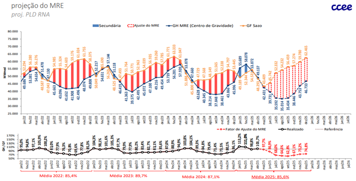 Diante do cenário de afluências abaixo da média em todo o país indicado pelo Operador Nacional do Sistema (ONS), projeta-se uma redução da geração hidrelétrica em relação ao mês anterior, com um aumento nos custos de geração devido à necessidade de acionamento de fontes de energia mais onerosas, como as usinas termoelétricas.