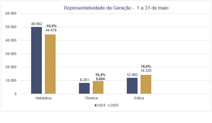 Em maio, atingiu-se uma geração de 97,7% em relação às Garantias Físicas para o ano de 2025: