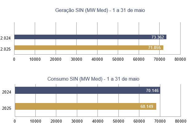 Em comparação ao mesmo período de 2024, temos leves decréscimos no consumo e na geração (-2,8% e -2,1%, respectivamente):