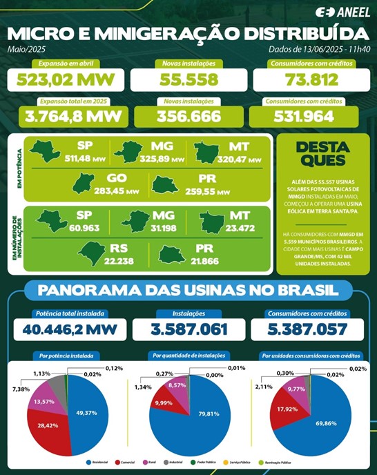 Apenas em 2025, foram instalados até maio 356 mil sistemas de MMGD, que acrescentaram 3,8 GW à oferta desses sistemas para a rede elétrica. Aproximadamente 532 mil consumidores passaram a obter créditos pela geração de energia nesses novos sistemas. Por meio da MMGD, o consumidor gera energia elétrica, a partir de fontes renováveis ou cogeração qualificada, e injeta na rede de distribuição a energia não utilizada, recebendo créditos para usar nos momentos em que não está gerando, por meio do Sistema de Compensação de Energia Elétrica (SCEE).