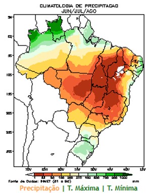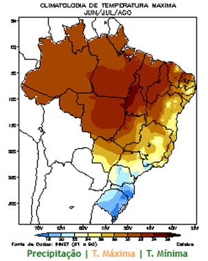 A temperatura máxima aumenta no norte do Brasil, enquanto que, na Região Sul e áreas serranas do Sudeste, predominam valores médios inferiores a 22ºC. As climatologias de precipitação e temperaturas máxima e mínima, no Brasil, são mostradas a seguir: